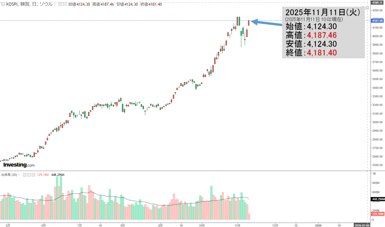 2025年11月11日(火)の韓国株式市場が締まりました。15:32現在、KOSPI(韓国総合株価指数)のチャートは以下のようになっています(チャートは『Investing.com』より引用)。ローソク足の上が削られてコマ足になってしまいま...
