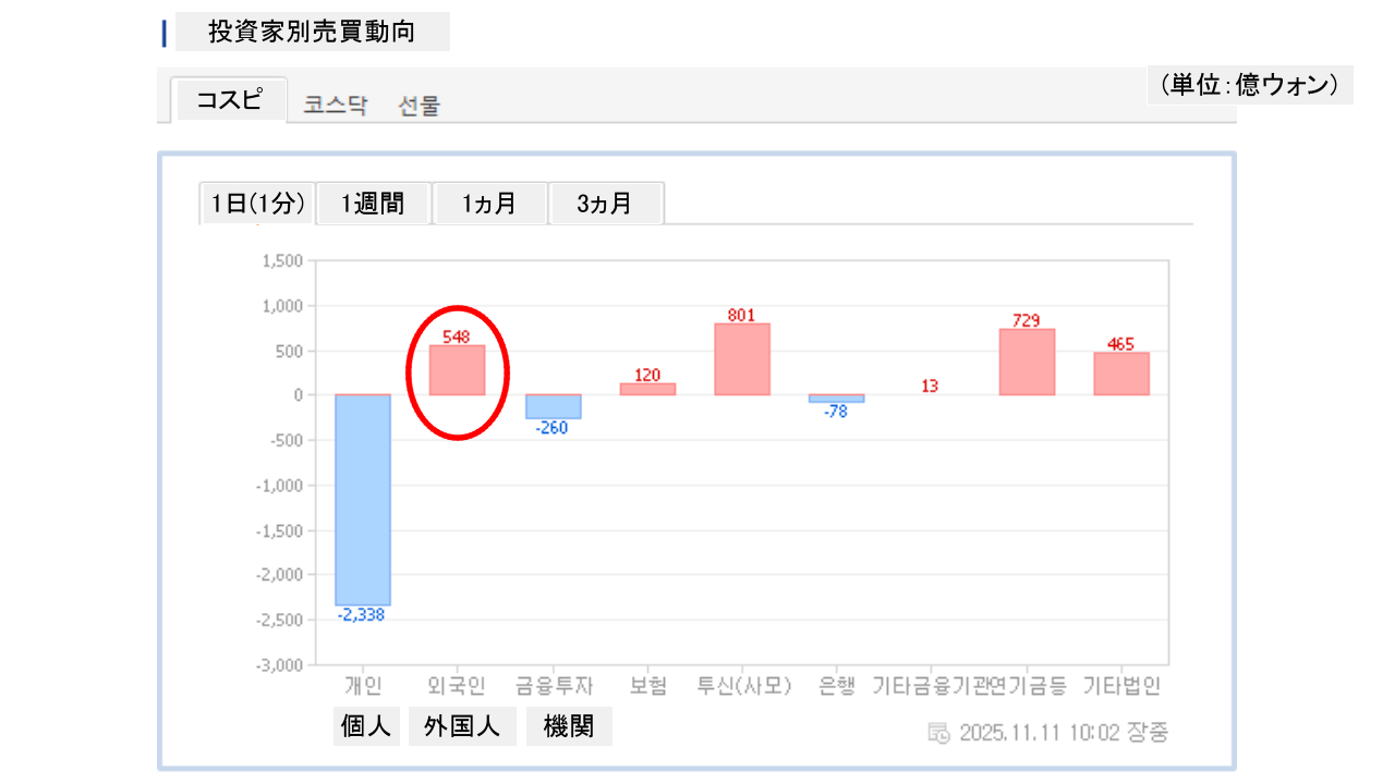 個人投資家は「2,338億ウォン」の売り越し。一方の外国人投資家は「548億ウォン」の買い越しです。