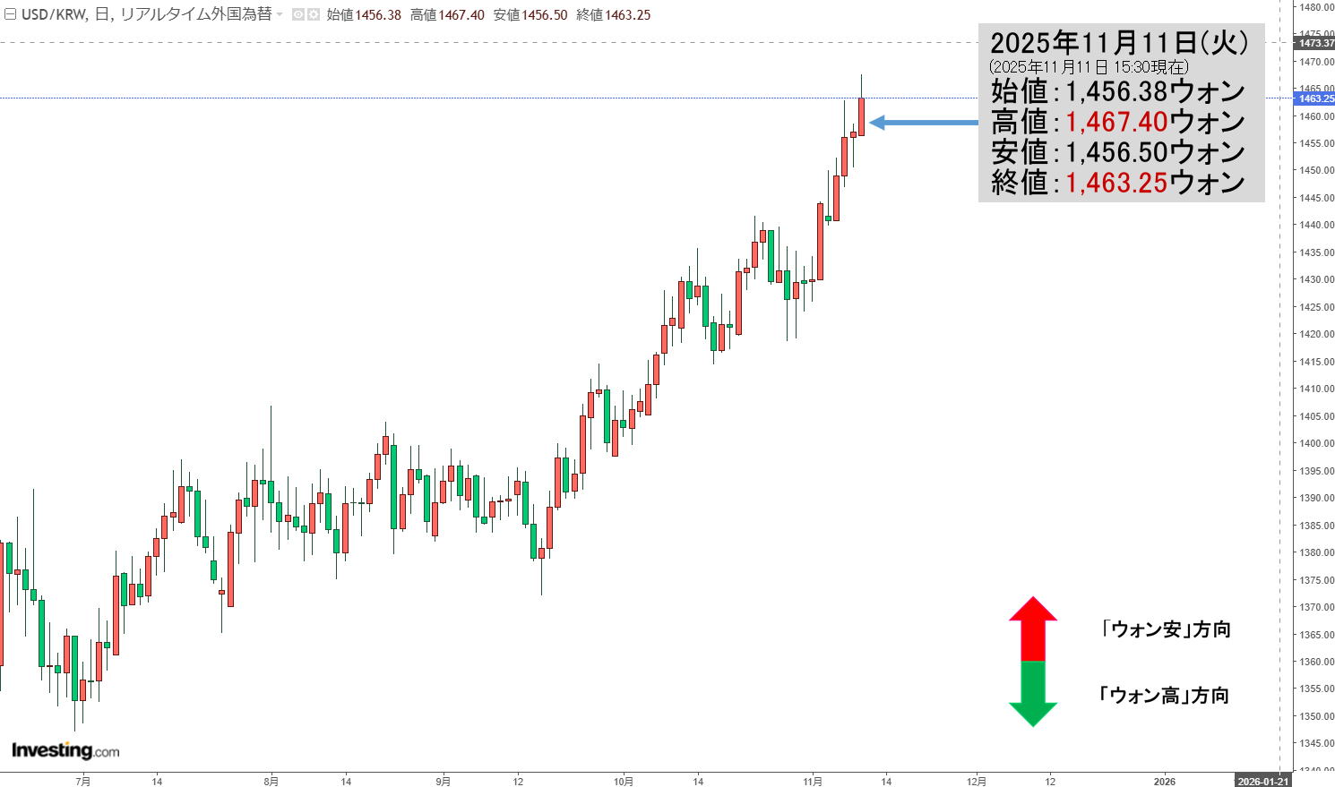 2025年11月12日(水)の市場が開きました。11:28現在、ドルウォンのチャートは以下のようになっています(チャートは『Investing.com』より引用)。現在のところ陽線で「1ドル=1,467ウォン」近辺の攻防となっています。ロー...