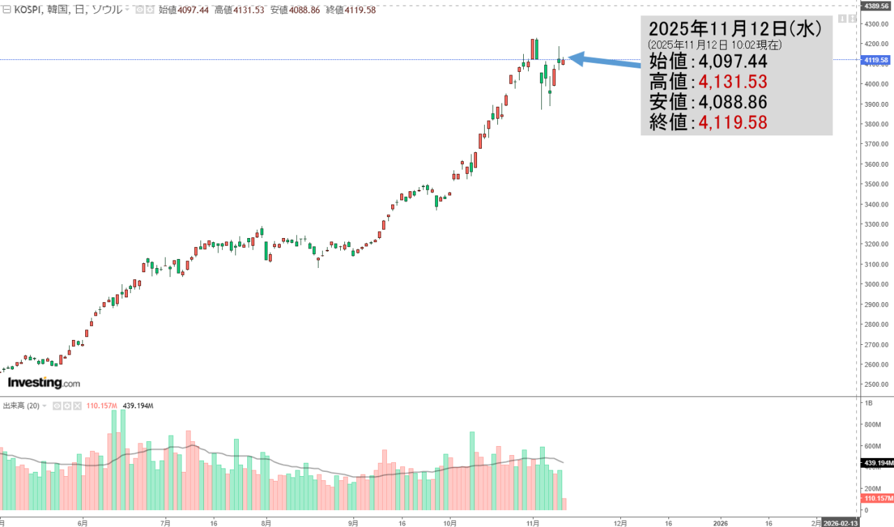 2025年11月12日(水)の韓国株式市場が締まりました。15:32現在、KOSPI(韓国総合株価指数)のチャートは以下のようになっています(チャートは『Investing.com』より引用)。陽線で終わりました。KOSPIは「4,150」...