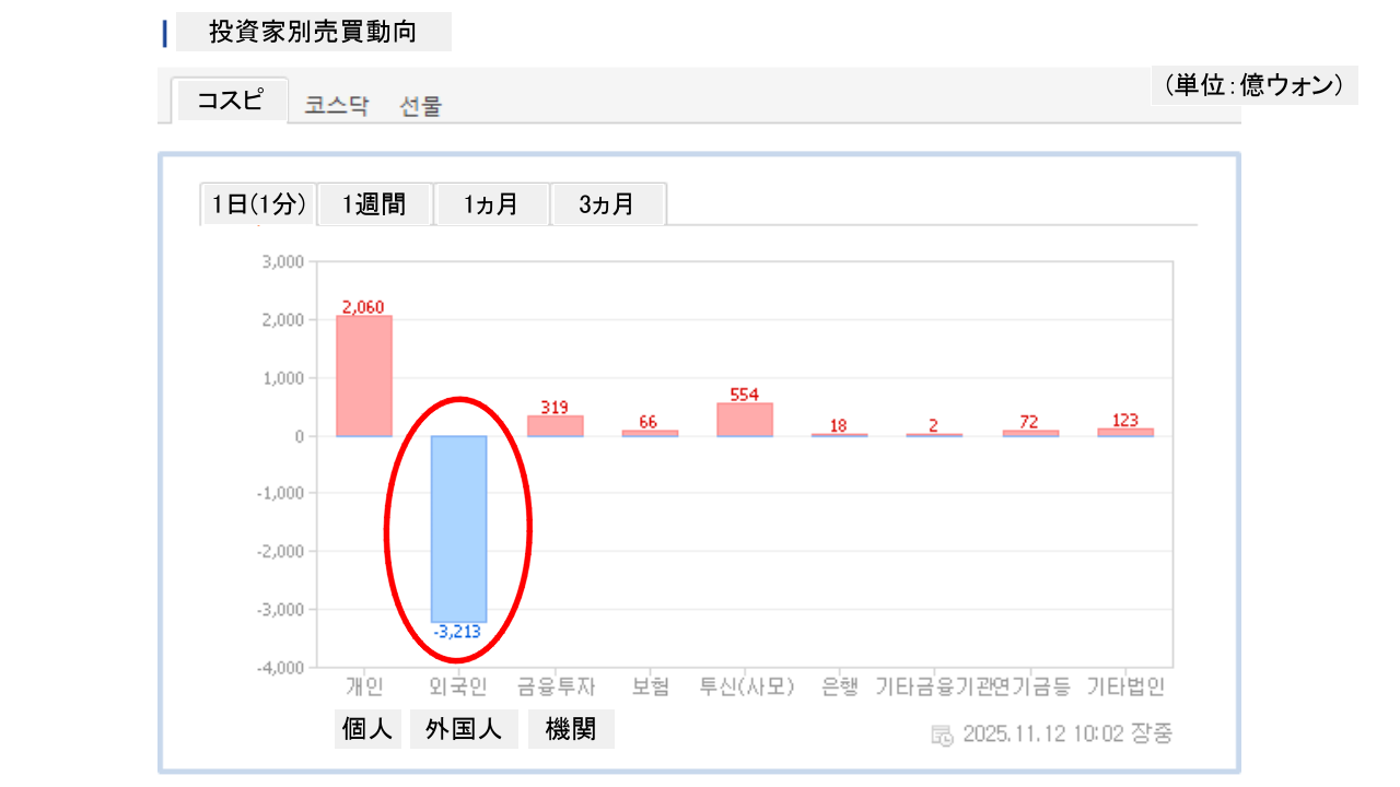 個人投資家は「2,060億ウォン」の買い越し。一方の外国人投資家は「3,213億ウォン」の売り越しです。