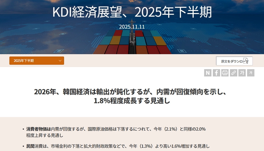 2025年11月11日、政府系シンクタンク『韓国開発研究院』(略称「KDI」)が、「2025年下半期の経済展望」を公表しました。