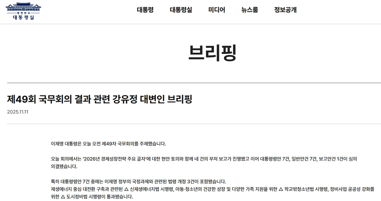 2025年11月11日、韓国で第49回国務会議が開催され、興味深い内容でした。