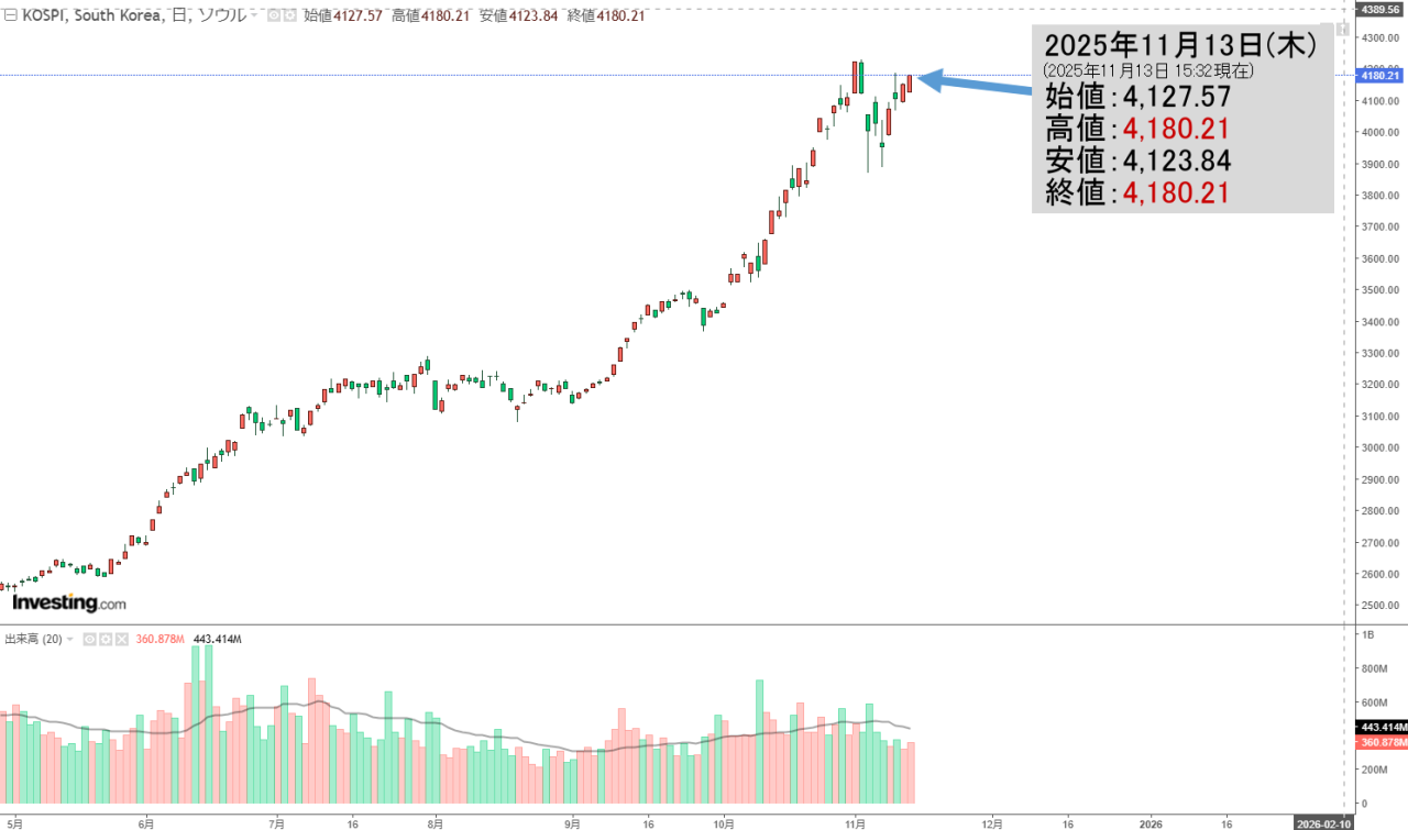 2025年11月13日(木)の韓国株式市場が締まりました。15:32現在、KOSPI(韓国総合株価指数)のチャートは以下のようになっています(チャートは『Investing.com』より引用)。