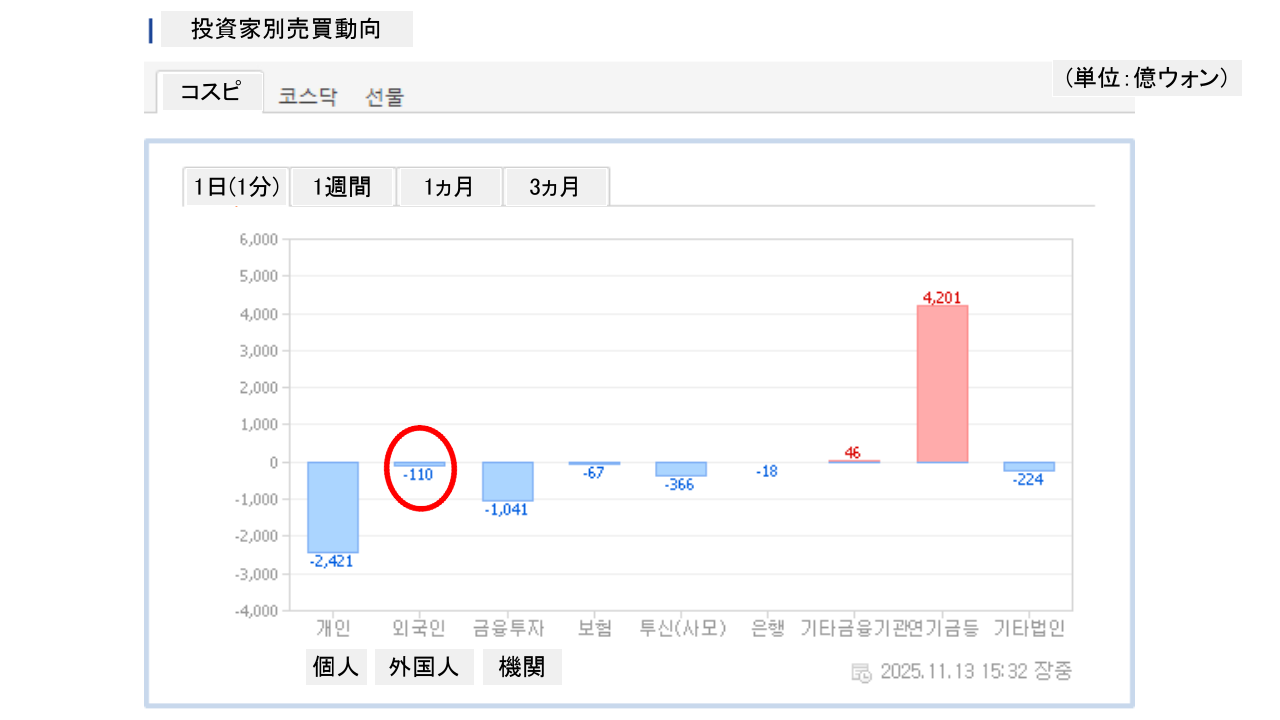 個人投資家は「2,421億ウォン」の売り越し。一方の外国人投資家は「110億ウォン」の売り越しです。