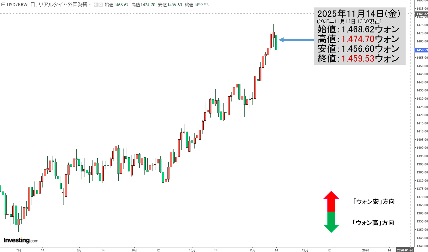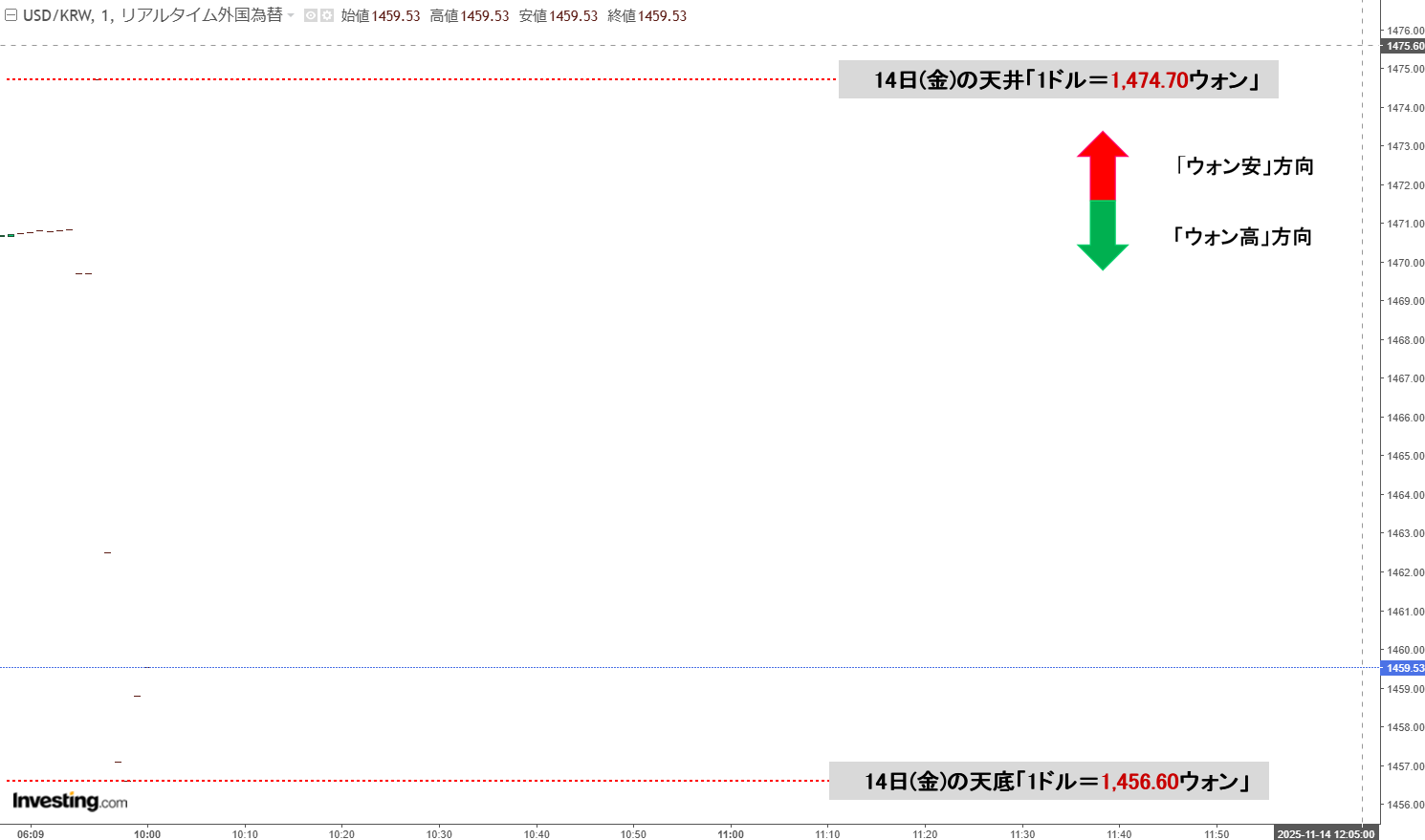 2025年11月14日(金)15:30現在、ドルウォンのチャートは以下のようになっています(チャートは『Investing.com』より引用)。陰線が伸びて、「1ドル=1,460ウォン」を割り込んでいます。現在のところ「1ドル=1,457ウ...