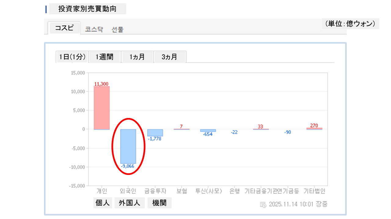 個人投資家は「1兆1,300億ウォン」の買い越し。一方の外国人投資家は「9,066億ウォン」の売り越しです。
