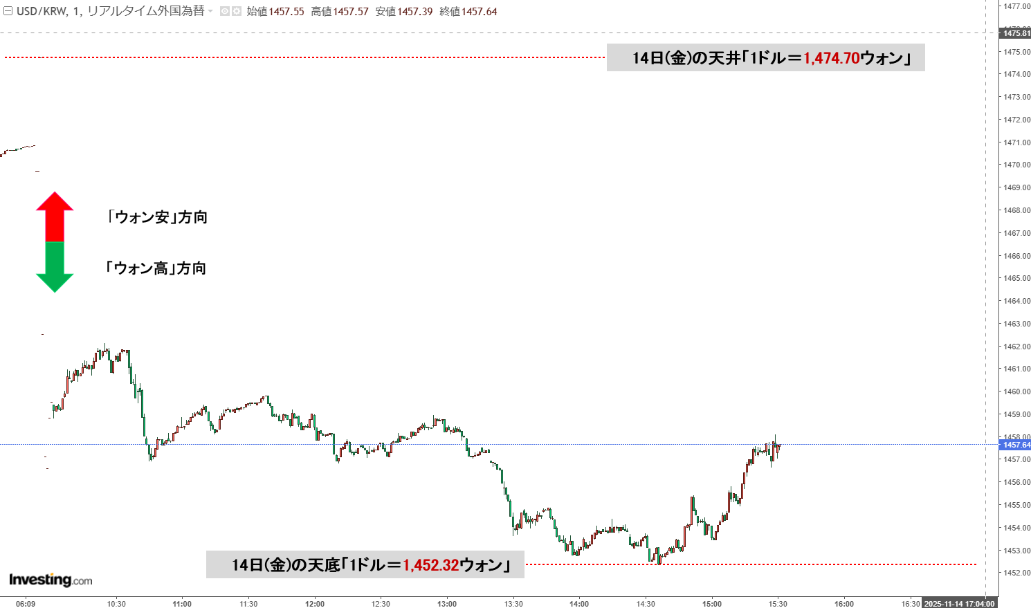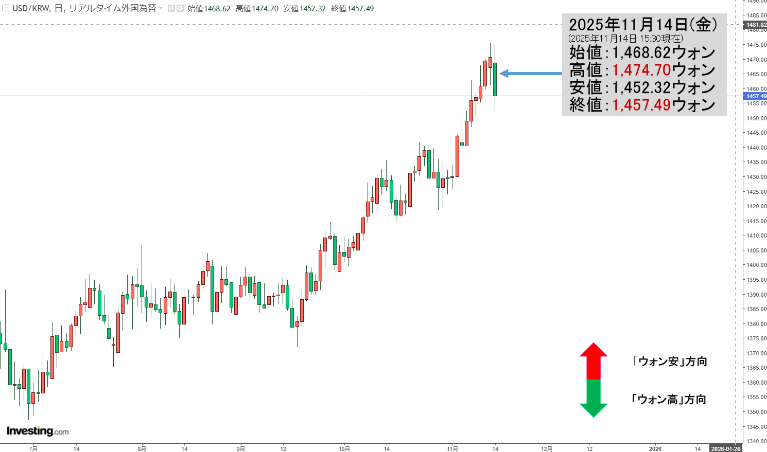 2025年11月14日(金)が(ほぼほぼ)締まりました。2025年11月15日 11:21現在、ドルウォンチャートは以下のようになっています(チャートは『Investing.com』より引用:以下同)。長い陰線となりました。ドーンとウォン高...