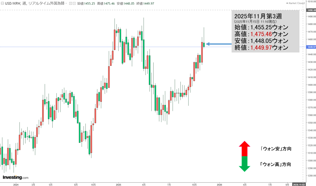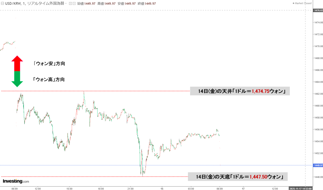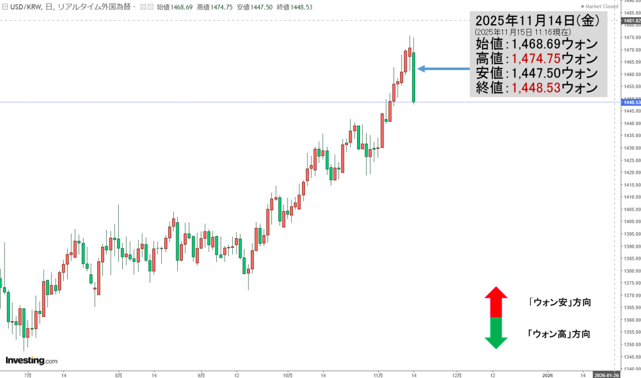 2025年11月14日(金)が(ほぼほぼ)締まりました。2025年11月15日 11:21現在、ドルウォンチャートは以下のようになっています(チャートは『Investing.com』より引用:以下同)。