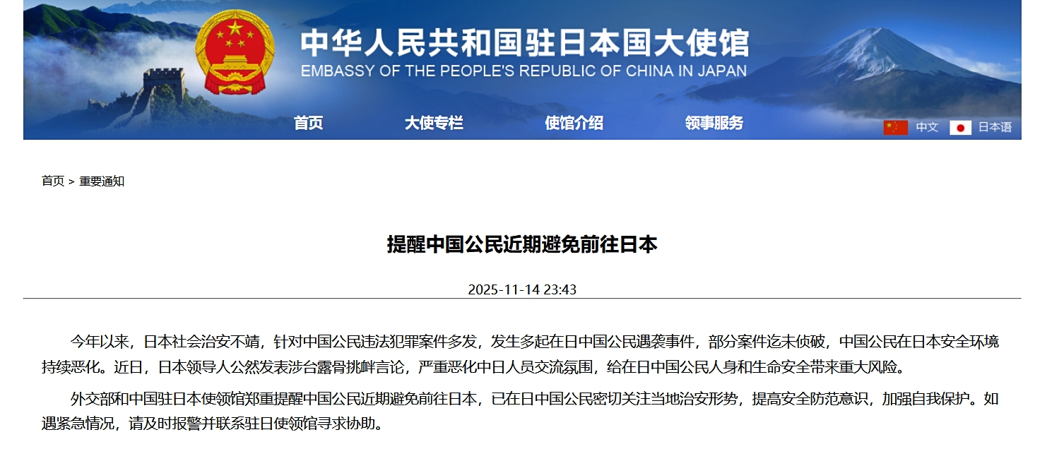 最近、日本の指導者が台湾に関して公然と露骨な挑発的発言を行い、日中間の人的交流の雰囲気を著しく悪化させ、日本在住の中国公民の身の安全・生命の安全に重大なリスクをもたらしている。