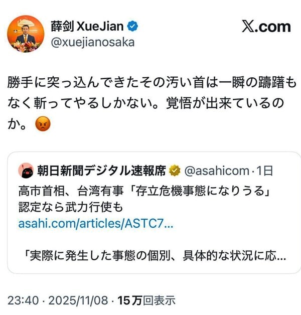 中国語で書いて中国国内向けに発信したのではなく、日本語で書き、日本の政治家(高市首相)へ直接侮辱・脅迫的示唆を行った――ことになるからです。