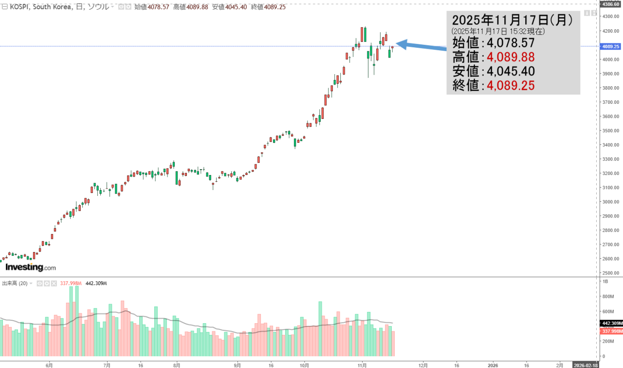 「韓国株式市場」11月18日(火)初動・KOSPI「4,012」陰線。