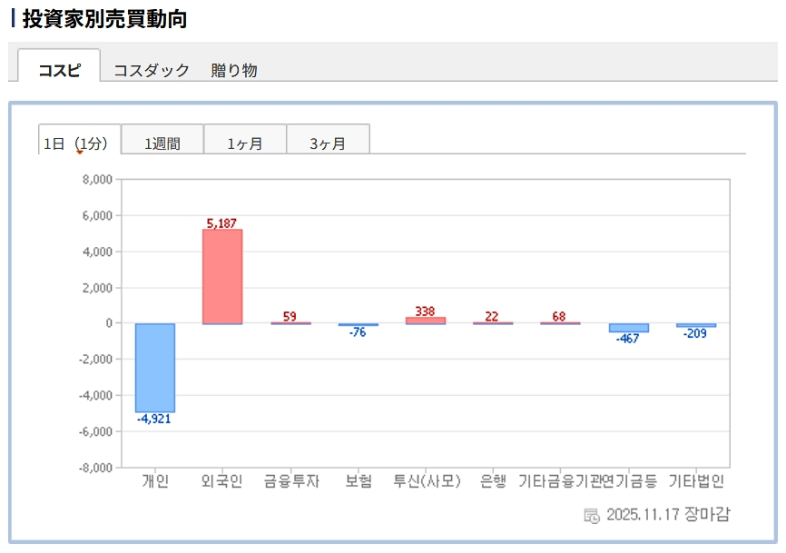 個人投資家は「4,921億ウォン」の売り越し。一方の外国人投資家は「5,187億ウォン」の買い越しです。