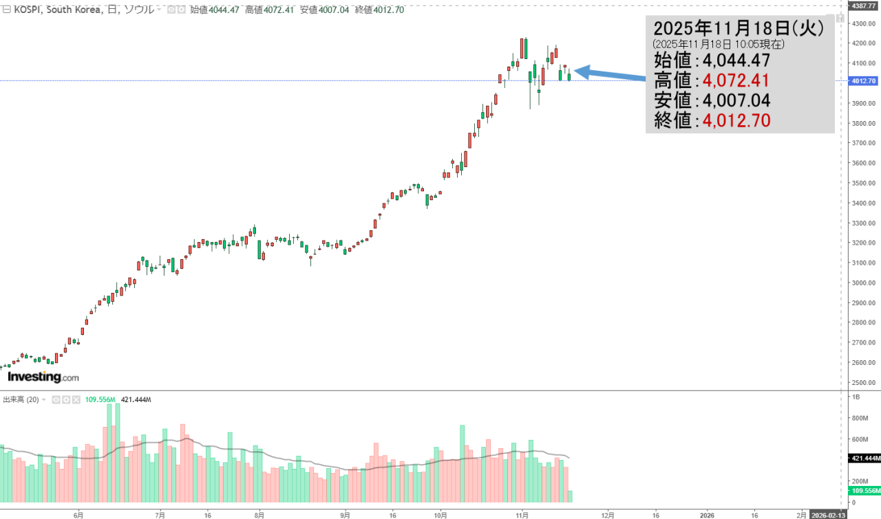 2025年11月18日(火)の韓国株式市場が締まりました。15:32現在、KOSPI(韓国総合株価指数)のチャートは以下のようになっています(チャートは『Investing.com』より引用)。韓国ガッカリ!です。4,000を割りました。K...