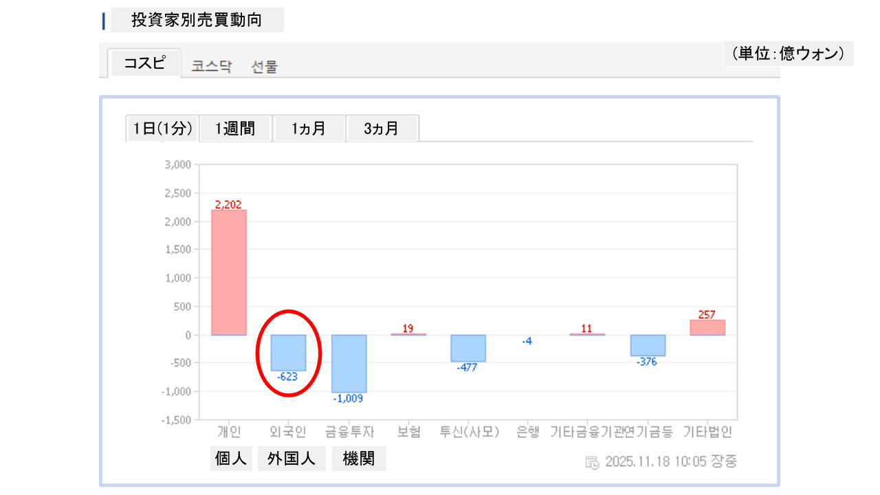 個人投資家は「2,202億ウォン」の買い越し。一方の外国人投資家は「623億ウォン」の売り越しです。