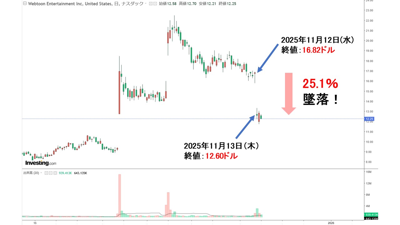 リアルタイムでご紹介しそこなったのですが、2025年11月13日(木)、アメリカ合衆国市場に上場している『Webtoon Entertainment(ウェブトゥーン・エンターテインメント)』の株価が暴落しました。