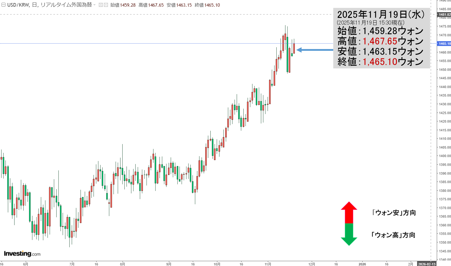 高値は「1ドル=1,465ウォン」で1470をうかがっています。