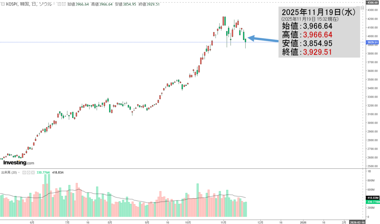 「韓国株式市場」11月20日(木)初動・KOSPI「4,011」ギャップアップ!