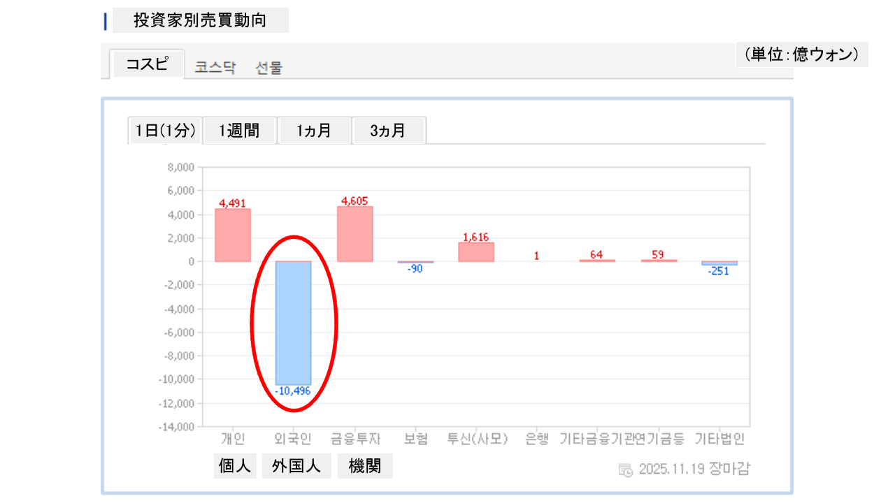 個人投資家は「4,491億ウォン」の買い越し。一方の外国人投資家は「1兆496億ウォン」の売り越しです。