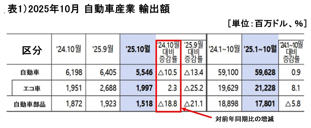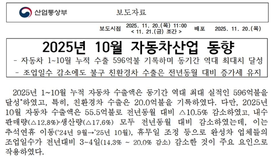 2025年11月20日、韓国の産業通商資源部が「10月の自動車産業の動向」を公表しました。