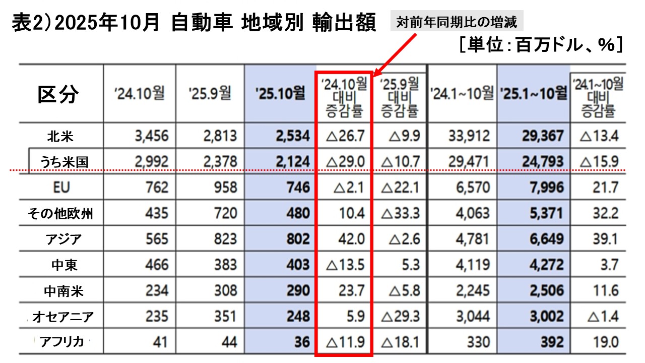 自動車の01〜10月累計輸出は596億ドルを記録し、同期間での歴代最大値――と誇っていますが、2025年単月では、対前年同期比で「-10.5%」です。