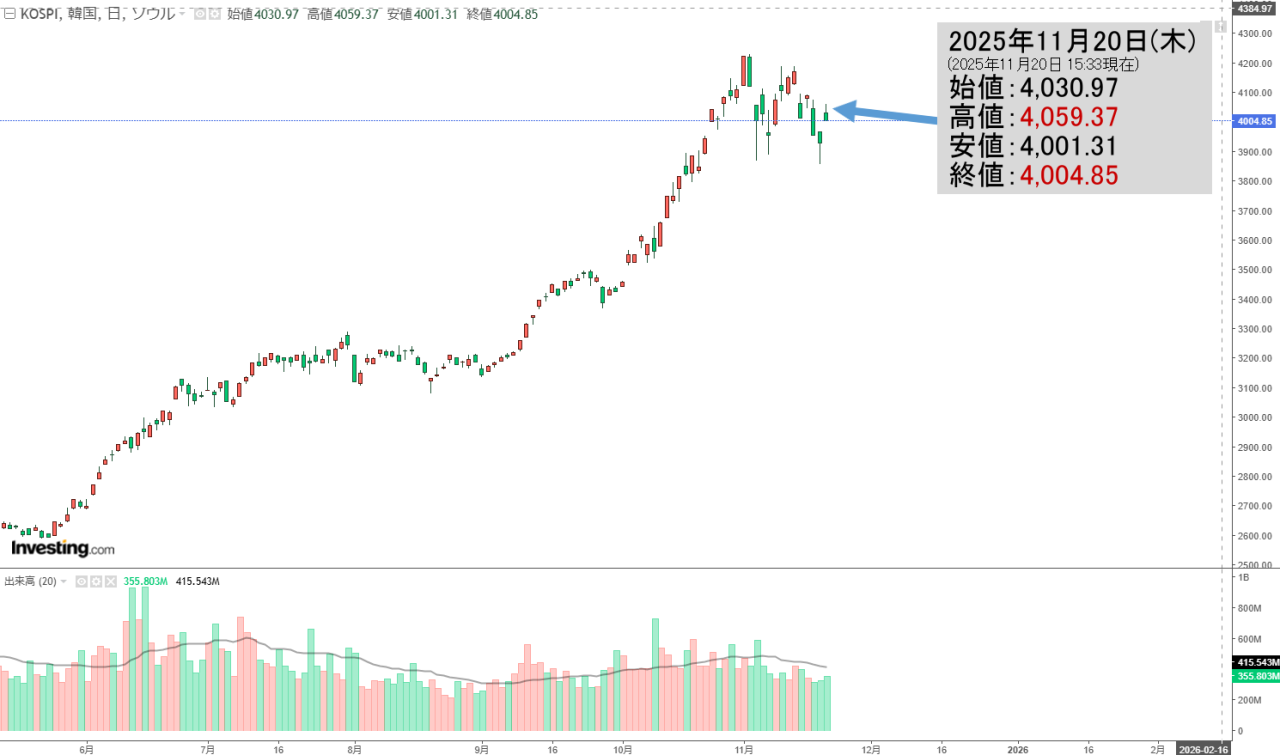 2025年11月20日(木)の韓国株式市場が締まりました。15:33現在、KOSPI(韓国総合株価指数)のチャートは以下のようになっています(チャートは『Investing.com』より引用)。
