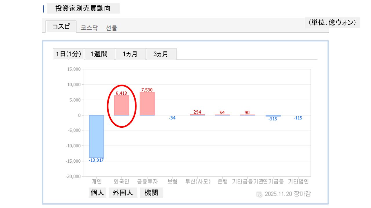 個人投資家は「1兆3,917億ウォン」の売り越し。一方の外国人投資家は「6,413億ウォン」の買い越しです。