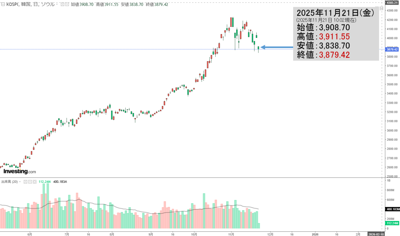 2025年11月21日(金)の韓国株式市場が締まりました。15:35現在、KOSPI(韓国総合株価指数)のチャートは以下のようになっています(チャートは『Investing.com』より引用)。KOSPIは「3,853」で締まりました。3,...