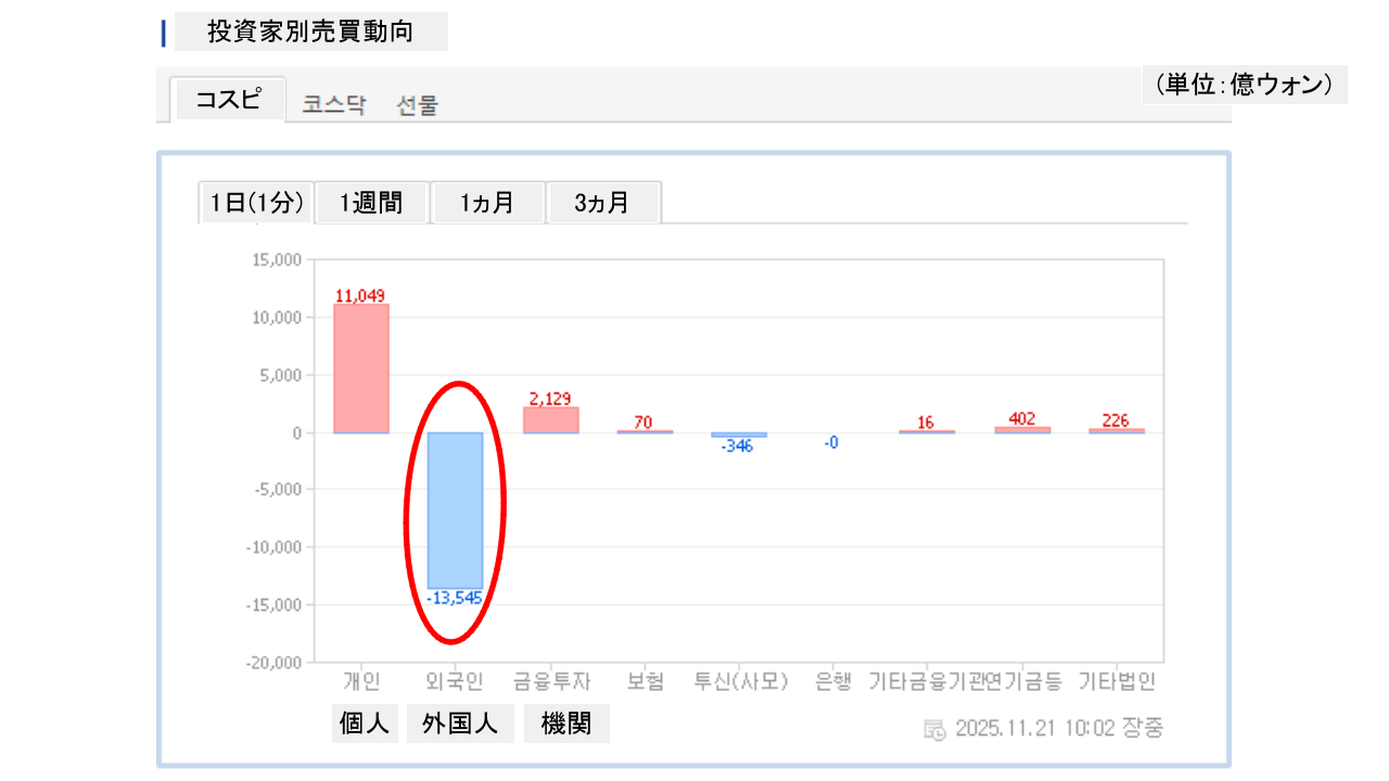 2025年11月21日(金)の韓国株式市場が締まりました。15:32現在、KOSPI(韓国総合株価指数)のチャートは以下のようになっています(チャートは『Investing.com』より引用)。投資家別売買動向は以下です。⇒データ引用元:『…