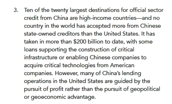 合衆国はこれまでに2,000億ドル超を受け入れており、その一部の貸付は、合衆国の重要インフラの建設を支援したり、中国企業が合衆国企業から重要技術を買収・取得するための資金となったりしている。