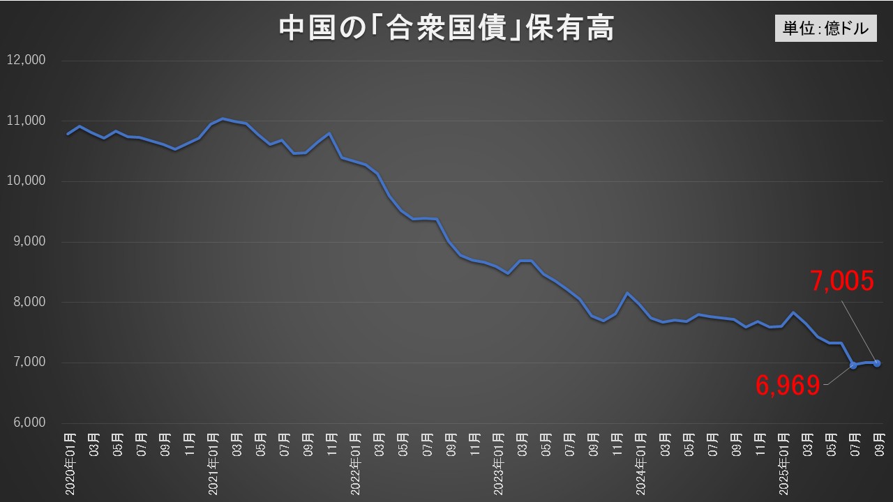 「08月:7,010億ドル」から「09月:7,005億ドル」へと保有額はさらに5億ドル減少しました。