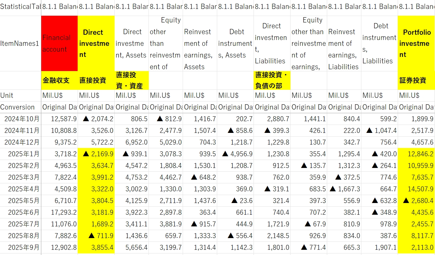 韓国の国際収支統計は、2025年09月分まで公表されています。毎度おなじみの『ECOS』のデータを見て、直接投資と証券投資の金額を確認してみると、以下のようになります。