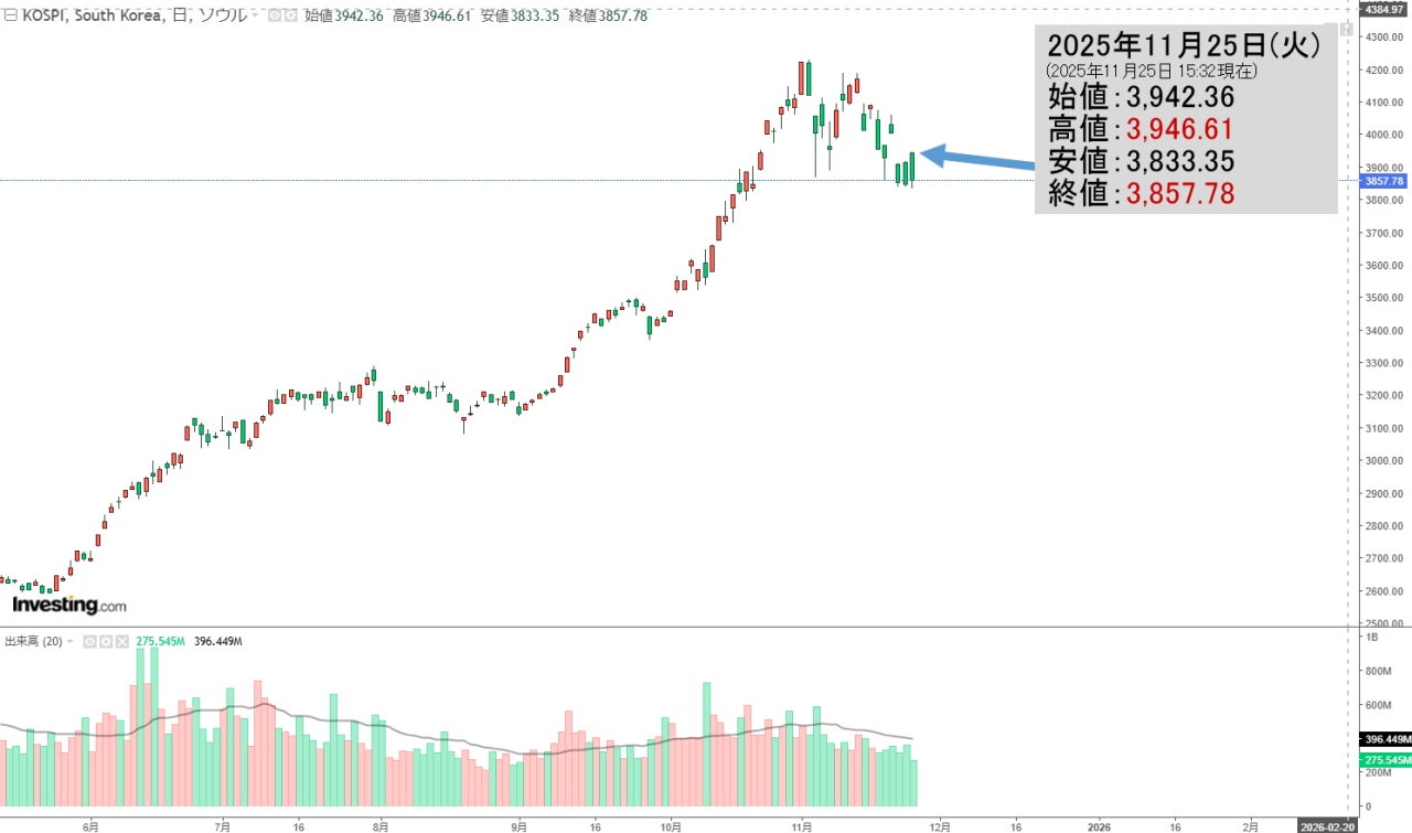 2025年11月25日(火)の韓国株式市場が締まりました。15:32現在、KOSPI(韓国総合株価指数)のチャートは以下のようになっています(チャートは『Investing.com』より引用)。