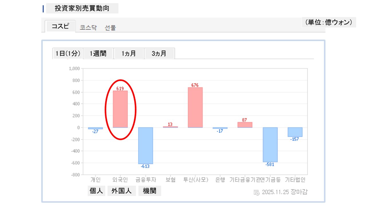個人投資家は「27億ウォン」の売り越し。一方の外国人投資家は「619億ウォン」の買い越しです。