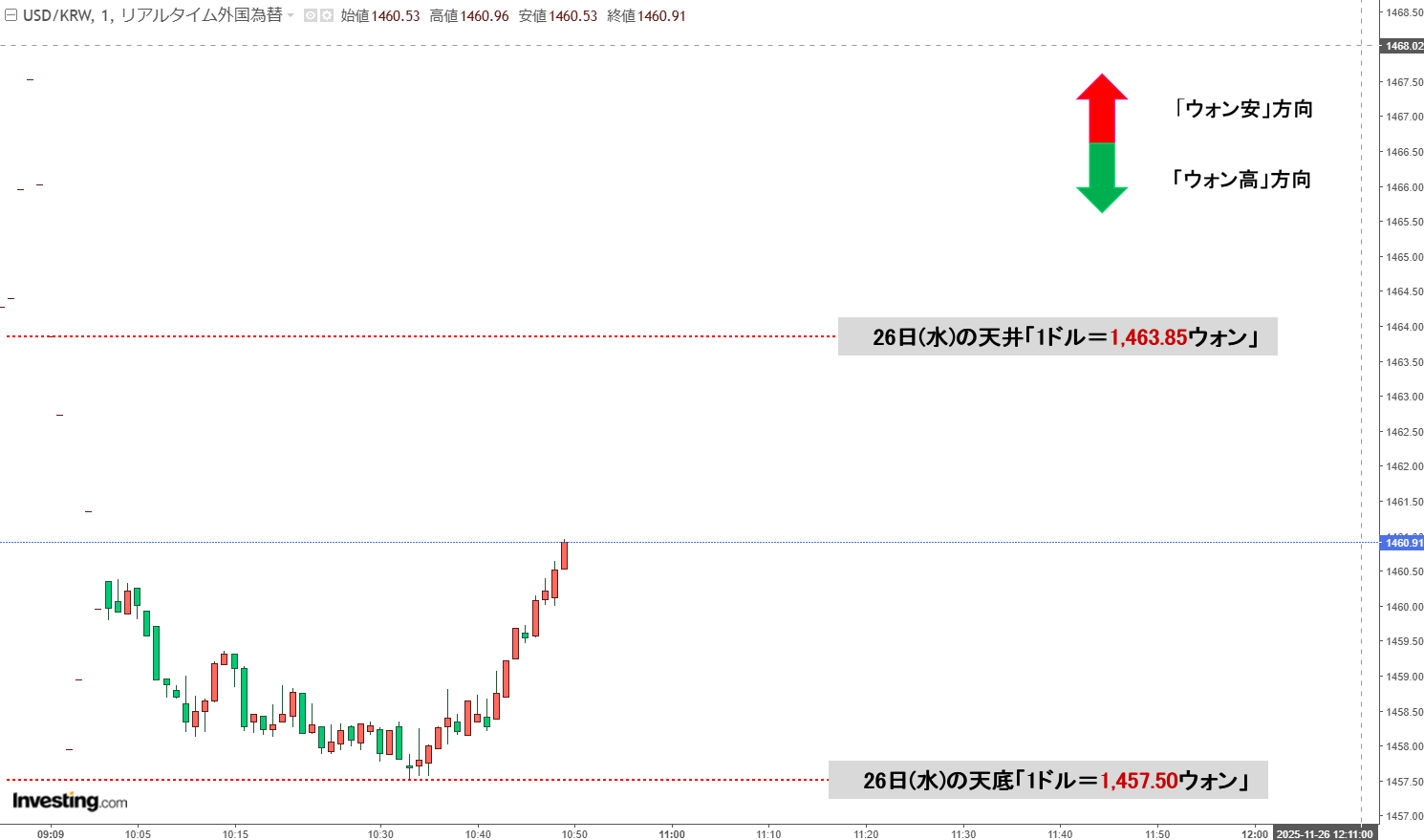 2025年11月26日(水)15:30現在、ドルウォンのチャートは以下のようになっています(チャートは『Investing.com』より引用)。下ヒゲが長くなりました。底から跳ね返って始値付近まで戻しました。現在のところ「1ドル=1,465...