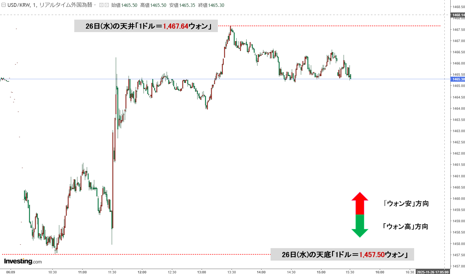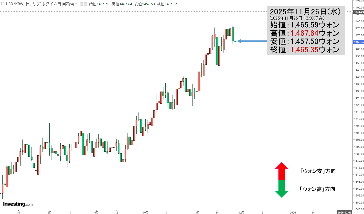 2025年11月26日(水)15:30現在、ドルウォンのチャートは以下のようになっています(チャートは『Investing.com』より引用)。