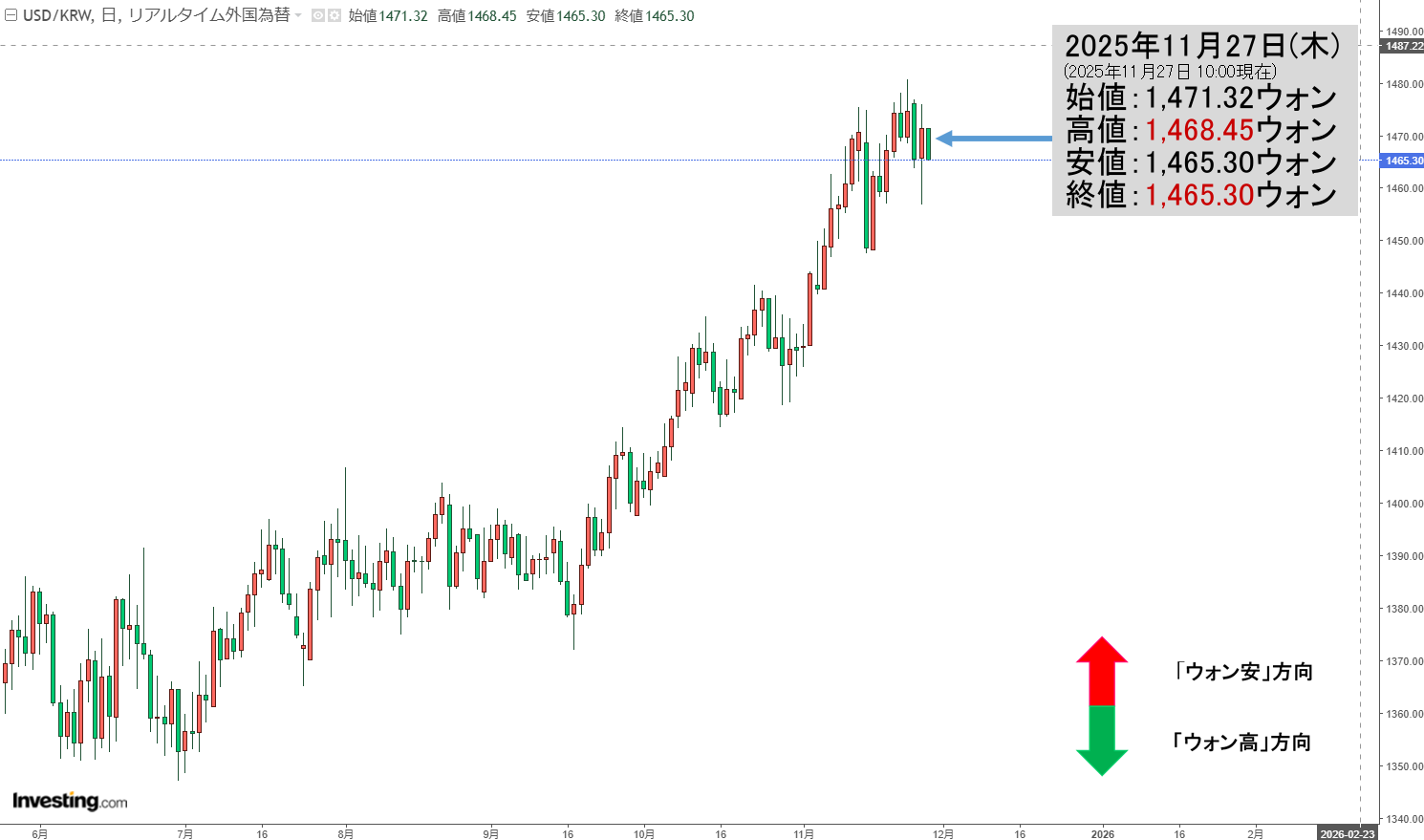 2025年11月27日(木)15:30現在、ドルウォンのチャートは以下のようになっています(チャートは『Investing.com』より引用)。底からは戻しましたが、現在のところまだ陰線。「1ドル=1,464ウォン」近辺の攻防となっています...