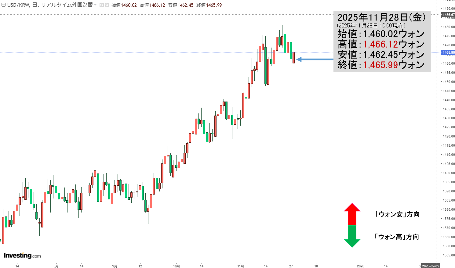 2025年11月28日(金)15:56現在、ドルウォンのチャートは以下のようになっています(チャートは『Investing.com』より引用)。前日始値までウォン安方向に戻りつつあります。現在のところ「1ドル=1,470ウォン」近辺の攻防と...