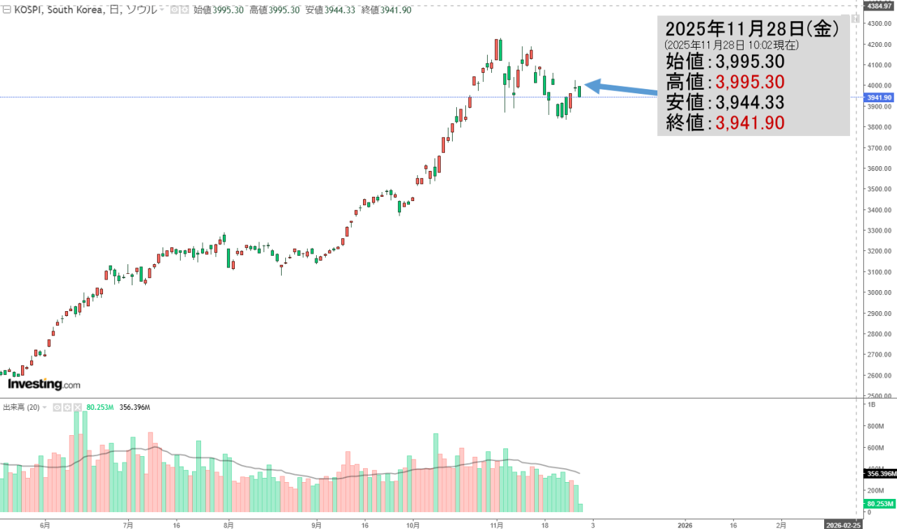 2025年11月28日(金)の韓国株式市場が締まりました。15:45現在、KOSPI(韓国総合株価指数)のチャートは以下のようになっています(チャートは『Investing.com』より引用)。残念ながら下げて陰線で締まりました。KOSPI...