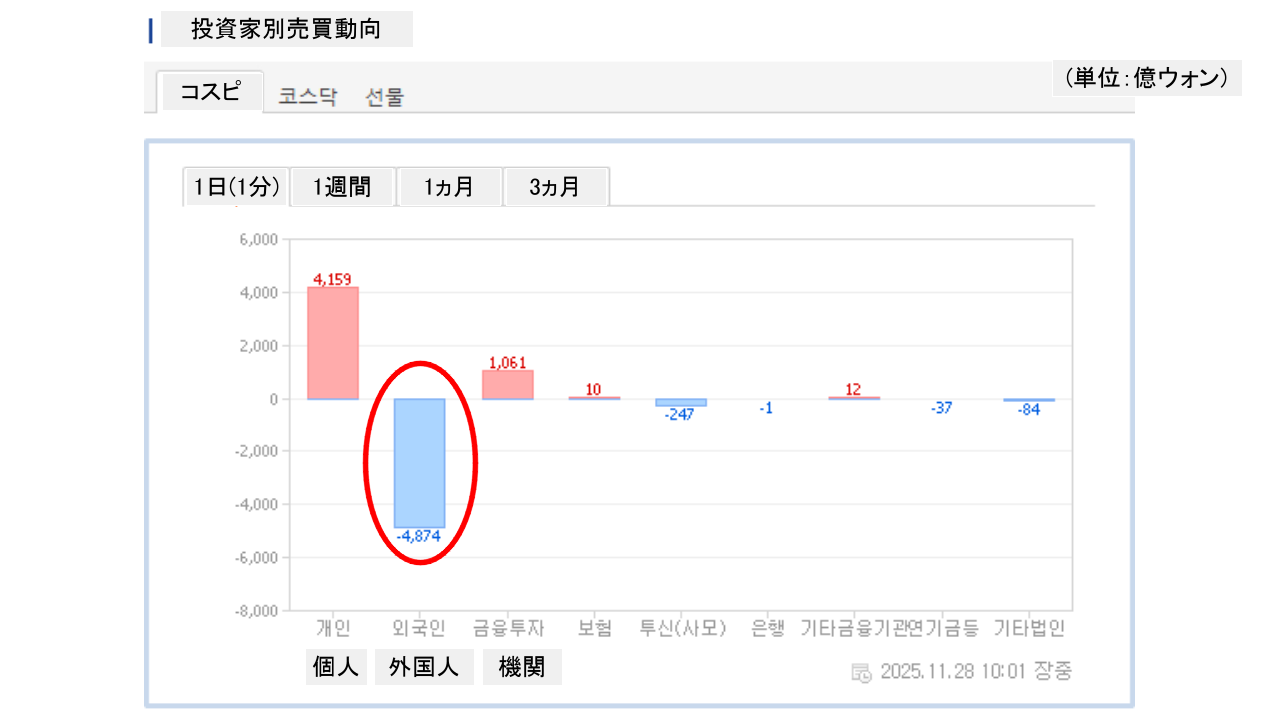 個人投資家は「4,159億ウォン」の買い越し。一方の外国人投資家は「4,874億ウォン」の売り越しです。