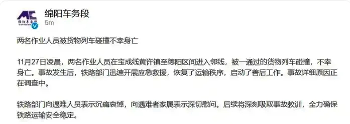 まず2025年11月27日0時27分頃、四川省徳陽市の宝成線、徳陽駅〜黄許鎮駅区間で21016次貨物列車が走行中に鉄道保守作業員2人と衝突。この2人は亡くなりました。