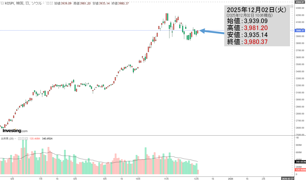 2025年12月02日(火)の韓国株式市場が締まりました。15:33現在、KOSPI(韓国総合株価指数)のチャートは以下のようになっています(チャートは『Investing.com』より引用)。陽線で終わりました。KOSPIは「3,994」...