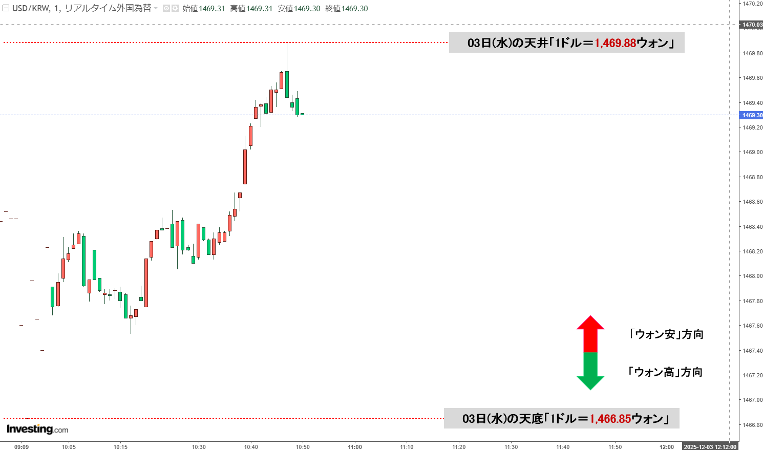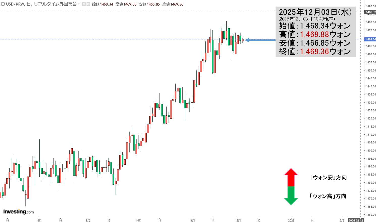2025年12月03日(水)15:30現在、ドルウォンのチャートは以下のようになっています(チャートは『Investing.com』より引用)。コマ足になりました。現在のところ「1ドル=1,468ウォン」近辺の攻防となっています。ローソク足...