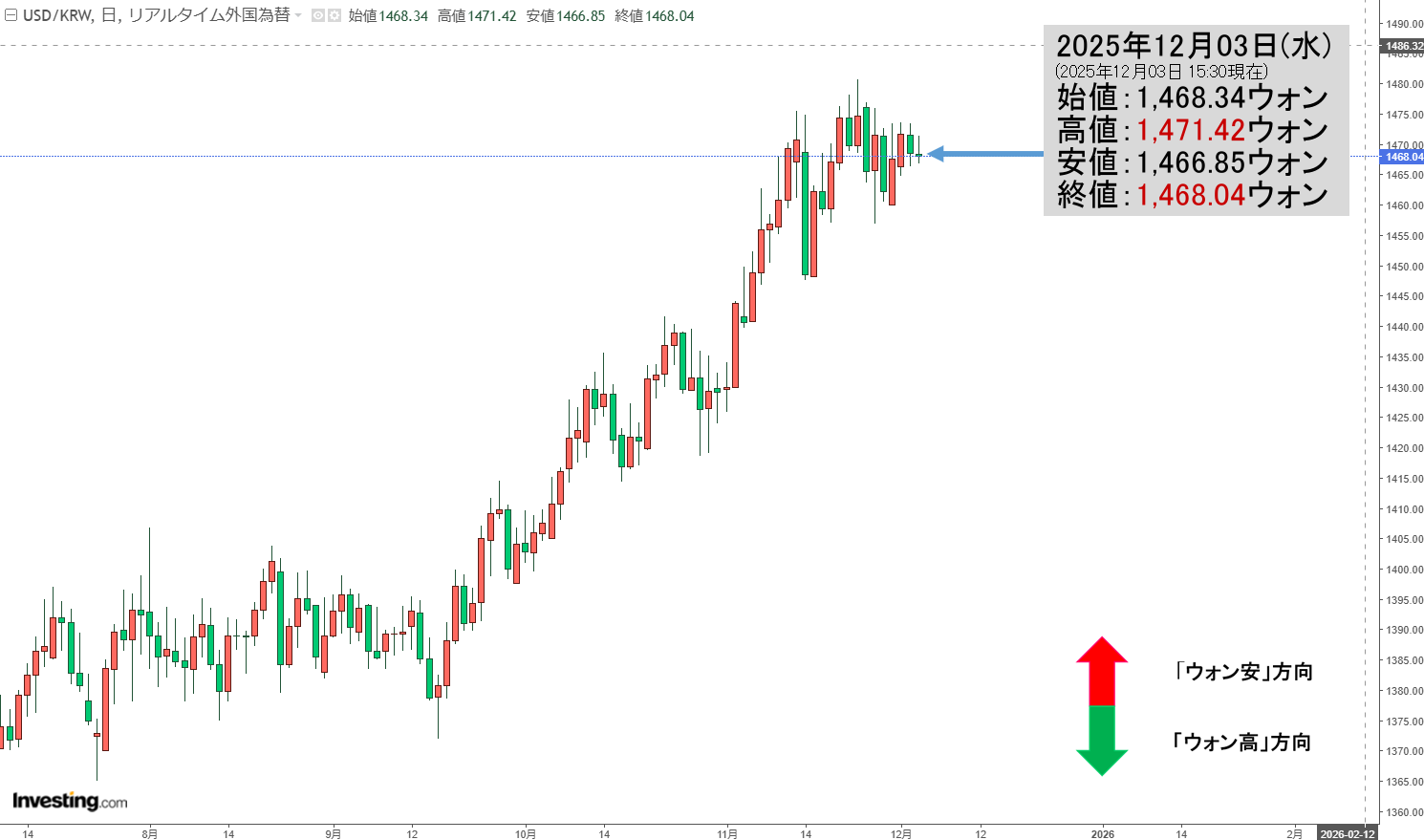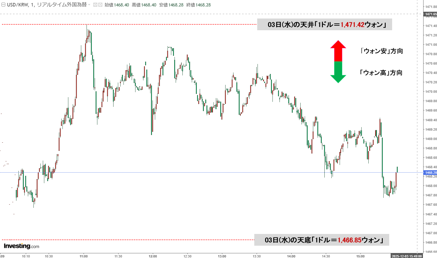 2025年12月04日(木)の市場が開きました。10:00現在、ドルウォンのチャートは以下のようになっています(チャートは『Investing.com』より引用)。現在のところ「1ドル=1,467ウォン」近辺の攻防となっています。ローソク足…
