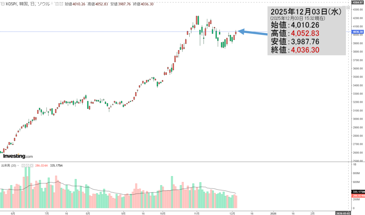 2025年12月04日(木)の韓国株式市場が開きましたので、KOSPIチャートの初動状況を以下の記事にまとめました。本記事と併せてお読み頂ければ幸いです。