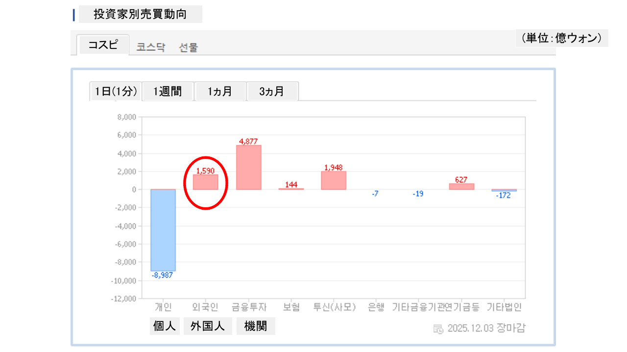 個人投資家は「8,987億ウォン」の売り越し。一方の外国人投資家は「1,590億ウォン」の買い越しです。