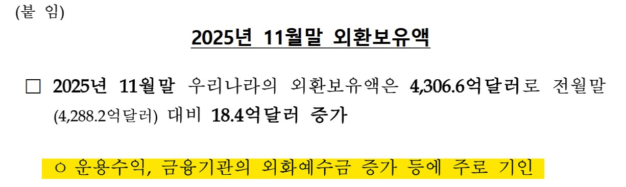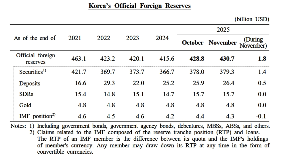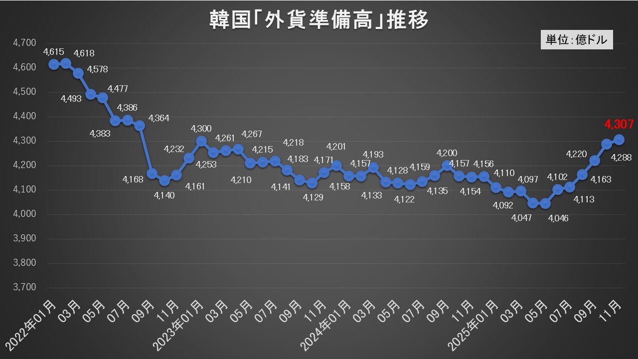 2025年12月03日、『韓国銀行』が「2025年11月の外貨準備高」を公表しました。