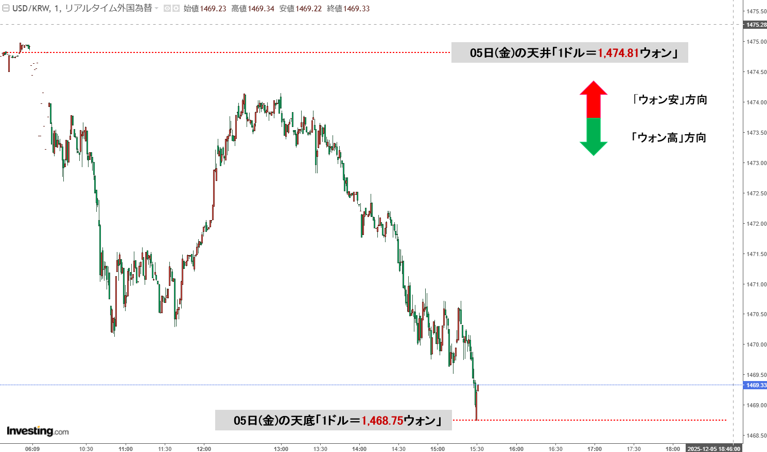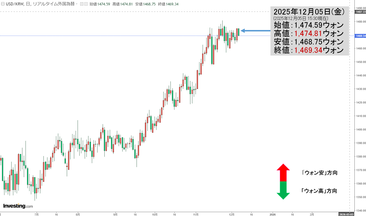 2025年12月05日(金)15:30現在、ドルウォンのチャートは以下のようになっています(チャートは『Investing.com』より引用)。