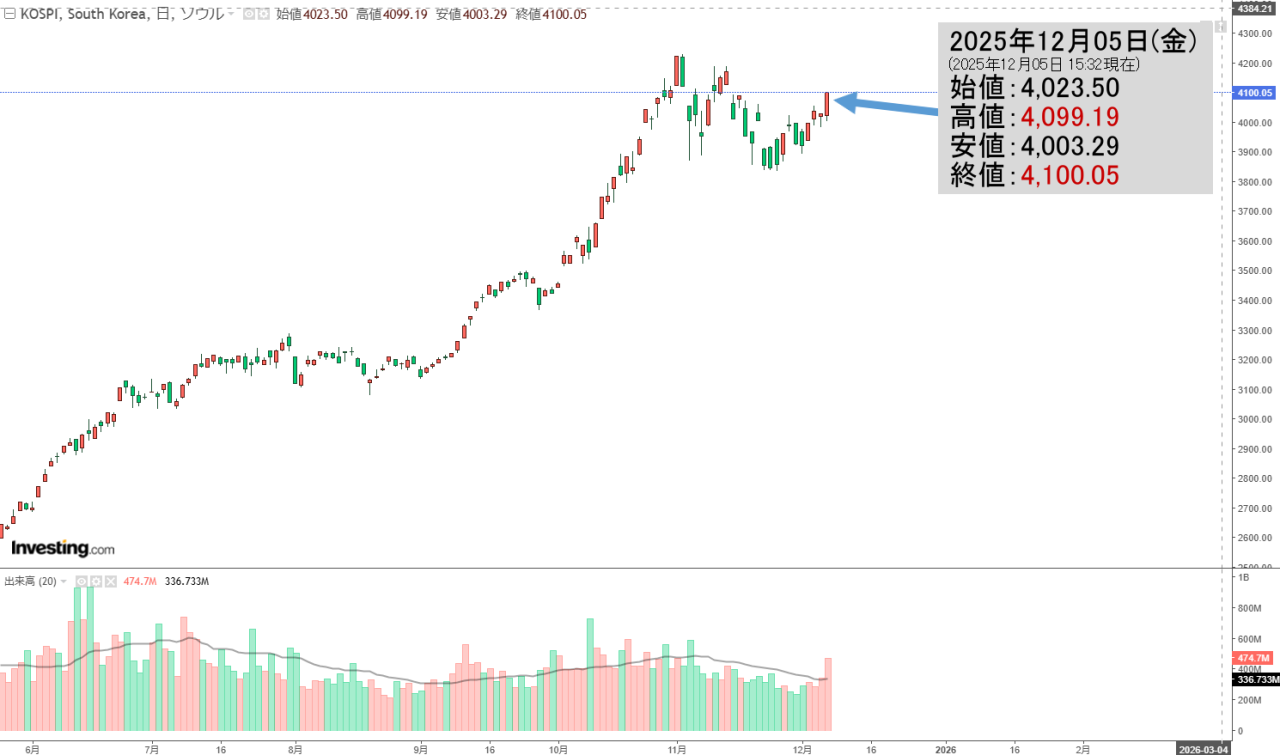 2025年12月05日(金)の韓国株式市場が締まりました。15:32現在、KOSPI(韓国総合株価指数)のチャートは以下のようになっています(チャートは『Investing.com』より引用)。