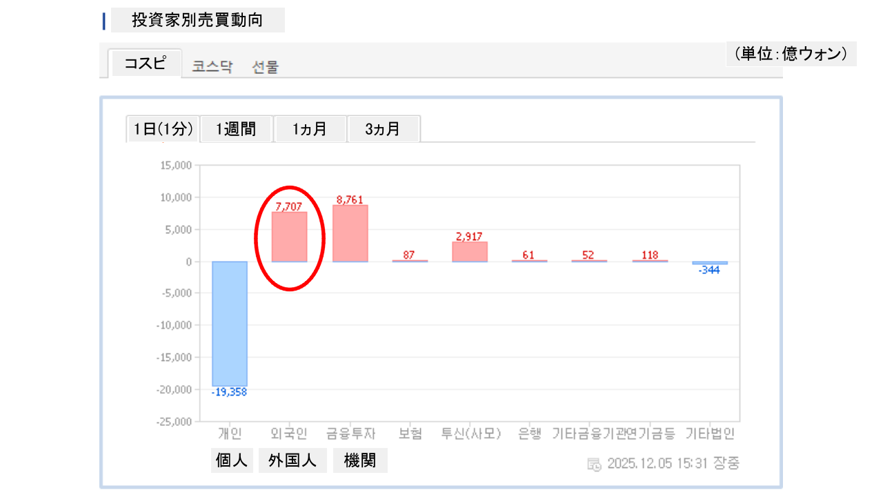 個人投資家は「1兆9,358億ウォン」の売り越し。一方の外国人投資家は「7,707億ウォン」の買い越しです。